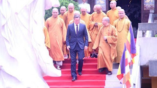 TT.Thích Thanh Phong đón tiếp và hướng dẫn ông David Cameron vào chánh điện lễ Phật